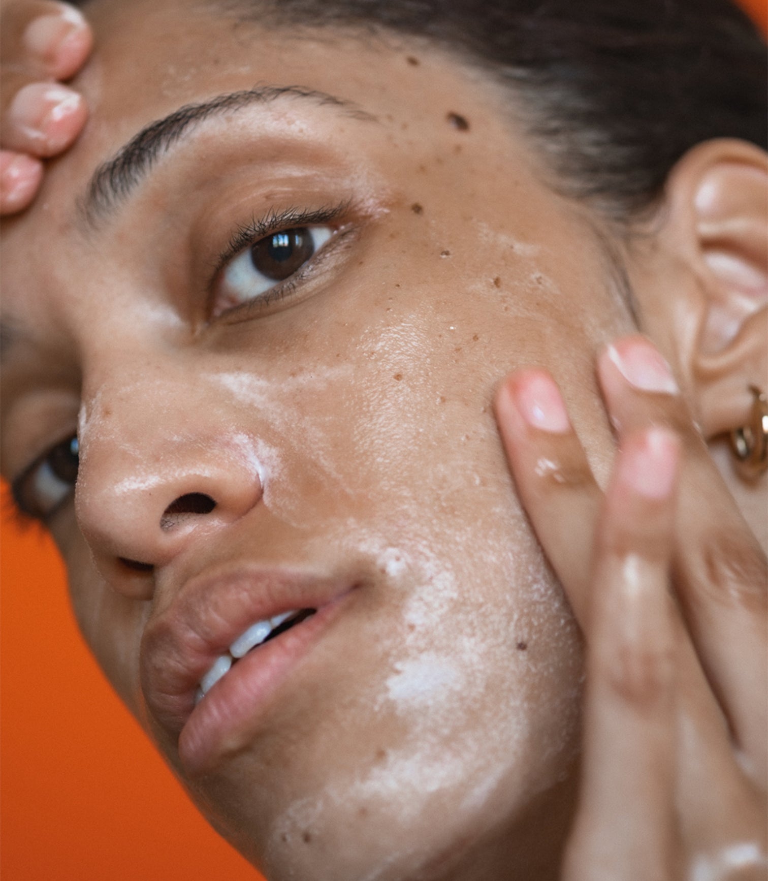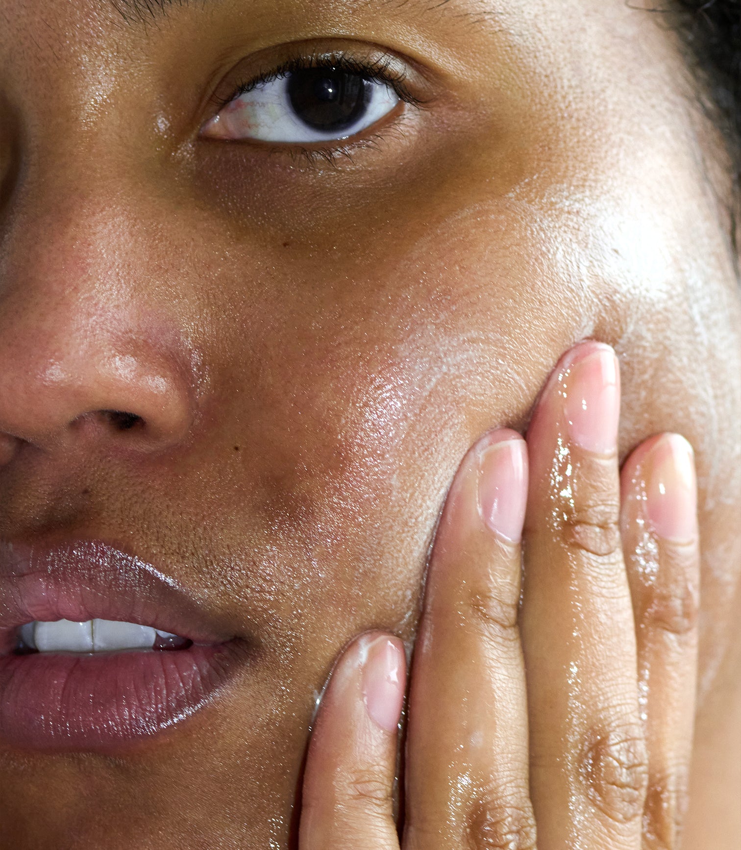 • Close-up of a person's face with a hand on their cheek, against a neutral background